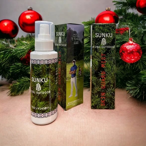 SUNKU SKIN GUARD MIST(スキンガードミスト)は、アカエゾ松の葉が持つ高い忌避効果に着眼し、アカエゾ松精油の研究・生産を行う一般社団法人Pine Grace並びに酪農学園大学協力のもと製造を行った虫よけ、アロマ効果を兼ねた化粧品スプレーとして開発されました。